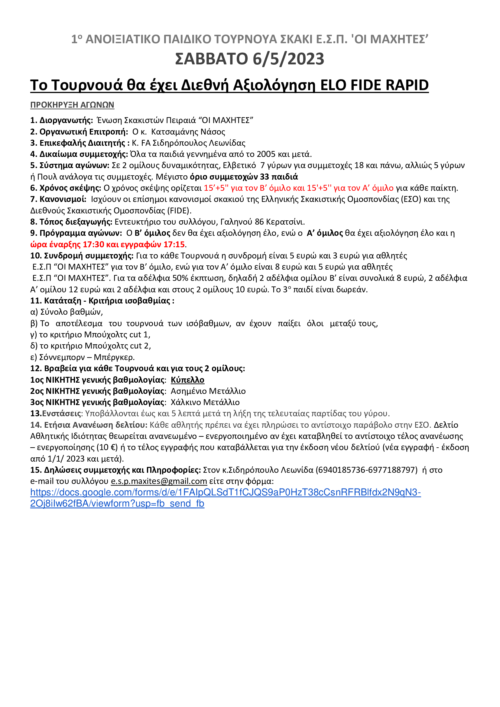 1ο ΑΝΟΙΞΙΑΤΙΚΟ ΠΑΙΔΙΚΟ ΤΟΥΡΝΟΥΑ ΣΚΑΚΙ Ε.Σ.Π. 'ΟΙ ΜΑΧΗΤΕΣ’ ΣABBATO 6/5/2023 Το Τουρνουά θα έχει Διεθνή Αξιολόγηση ELO FIDE RAPID