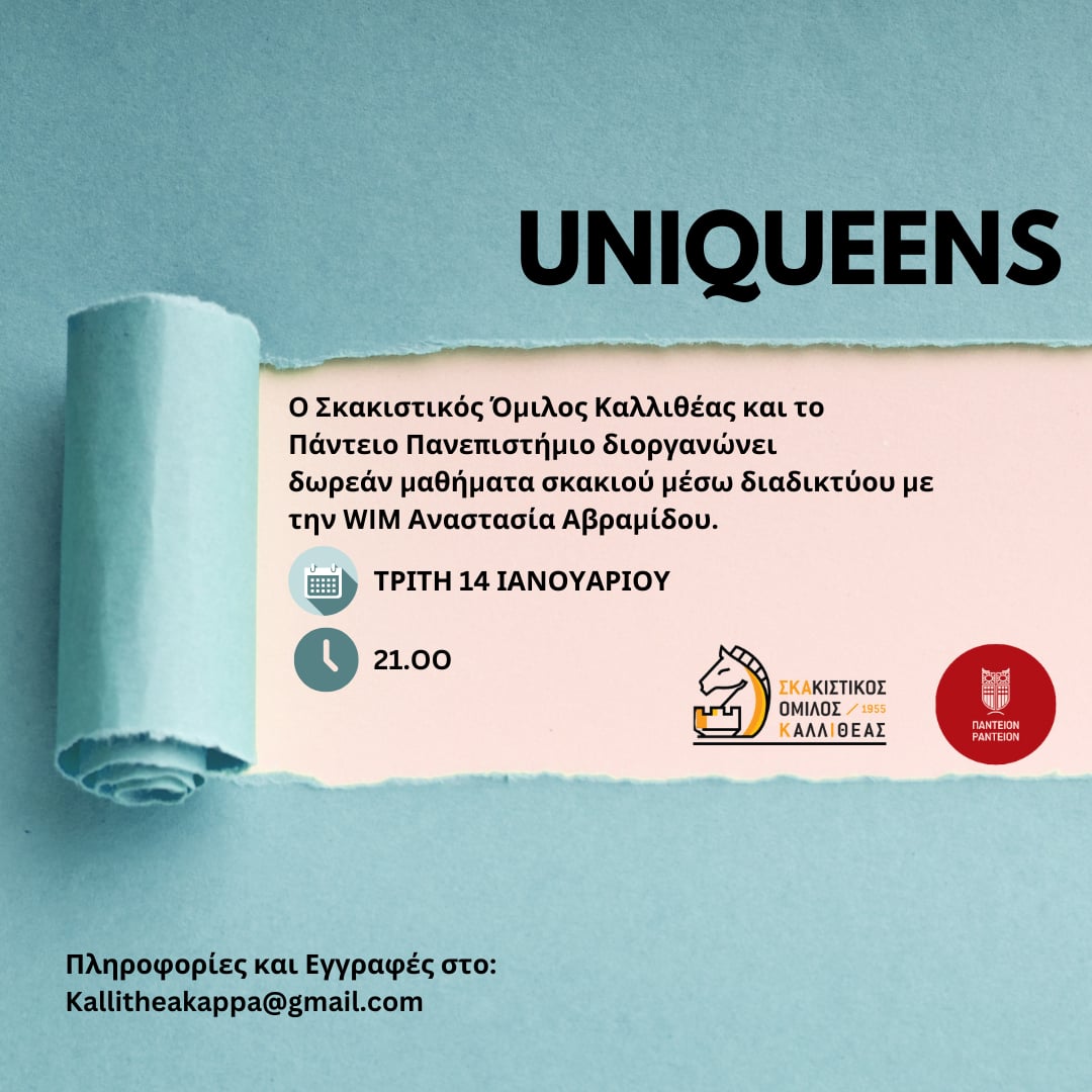 Το Πάντειο Πανεπιστήμιο και ο Σκακιστικός Όμιλος Καλλιθέας διοργανώνουν δωρεάν διαδικτυακά μαθήματα σκακιού για όλες τις φοιτήτριες της Ελλάδας. Τα μαθήματα θα πραγματοποιούνται κάθε Τρίτη, στις 21.00, με το πρώτο μάθημα την Τρίτη 14 Ιανουαρίου.